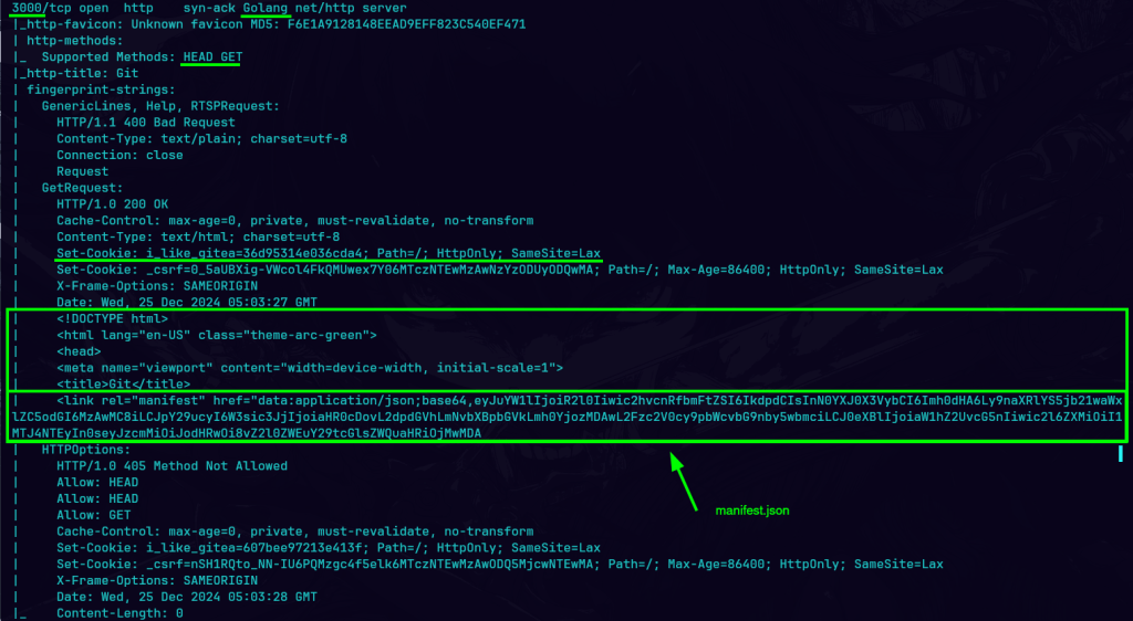 En el puerto 3000 corre un servidor web basado en Go Golang. Este servidor solo admite los métodos HTTP HEAD y GET. Además, incluye una cabecera Set-Cookie con una cookie marcada como Path=/ HttpOnly y SameSite=Lax, no tendra via con los subdominios y protege contra ataques de XSS y CSRF. También contiene un enlace a un archivo manifest.json codificado en Base64.