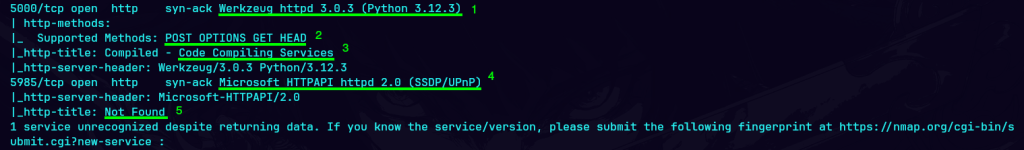 4) El puerto predeterminado para WinRM esta abierto e Indica que el servidor está utilizando Microsoft HTTPAPI, una API para servicios de red en Windows. La versión es 2.0 y está relacionado con SSDP (Simple Service Discovery Protocol) busca dispositivos (UPnP) y conectarlos a otro dispositivo dentro de una red privada o pública, UPnP (Universal Plug and Play) crean canales de comunicación más directos. Esto nos da un indicio que podriamos utilizar evil-winrm.