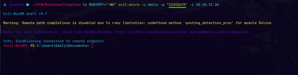 Pruebo las credenciales proporcionadas en la base de datos, por medio del puerto 5985 de WinRM. Utilizando la herramienta evil-winrm.