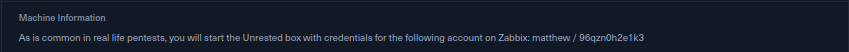 En esta ocacion nos brindan credenciales en la cuenta Zabbix: matthew / 96qzn0h2e1k3