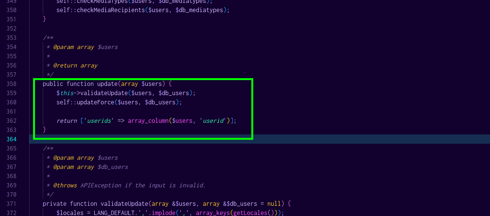 La función update se encarga de actualizar la información de un conjunto de usuarios en un sistema de gestión. Recibe un array de usuarios, valida los datos mediante el método validateUpdate, y luego aplica las actualizaciones en la base de datos a través del método updateForce. Finalmente, devuelve un array con los identificadores de usuario (userid) de los usuarios que han sido actualizados. no hay comprobaciones de autorización y el usuario autenticado en la API puede actualizar usuarios libremente.