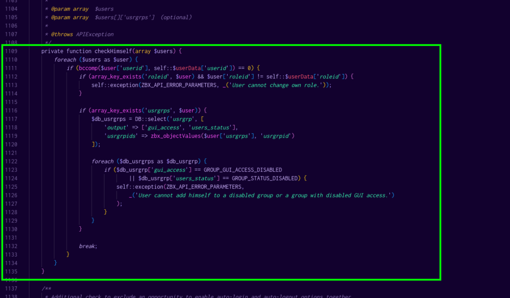 El método checkHimself valida que un usuario no intente realizar cambios no permitidos en su propia cuenta, como cambiar su rol o añadirse a grupos de usuarios deshabilitados. usrgrps no tiene ningún tipo de validación, y por lo tanto se puede abusar de él.