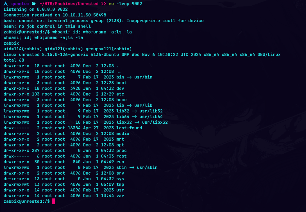 Obtengo acceso a una shell del servidor a través del servicio Zabbix. Verifico el usuario actual, los grupos a los que pertenece, los usuarios conectados al sistema y la información del sistema. También enumero los directorios presentes, incluidos los ocultos.