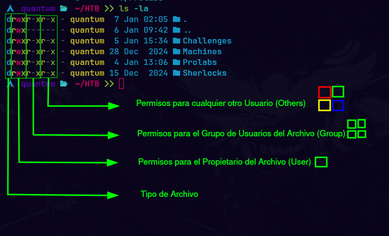 Tiene un conjunto de permisos que se aplican a tres categorías el propietario, que es el usuario que creó el archivo, el grupo, que es un grupo de usuarios que pueden tener permisos específicos sobre el archivo, y otros, que son todos los demás usuarios que no son el propietario ni pertenecen al grupo. Los tipos de permisos incluyen lectura (r), que permite leer el contenido del archivo o listar el contenido del directorio, escritura (w), que permite modificar el contenido del archivo o agregar/eliminar en un directorio, y ejecución (x), que permite ejecutar un archivo como un programa o acceder a un directorio. Se representan en forma de una cadena de 10 caracteres, donde el primer carácter indica el tipo de archivo ( - para archivos regulares, d para directorios, b archivo especial de bloque, manejan datos en bloques. c Archivo especial de caracteres, manejan datos en flujos de caracteres. l enlace simbolico, apunta a otro archivo o directorio. p tubo nombrado(named pipe), para la comunicación entre procesos. s socket. para la comunicación entre procesos en la misma máquina).