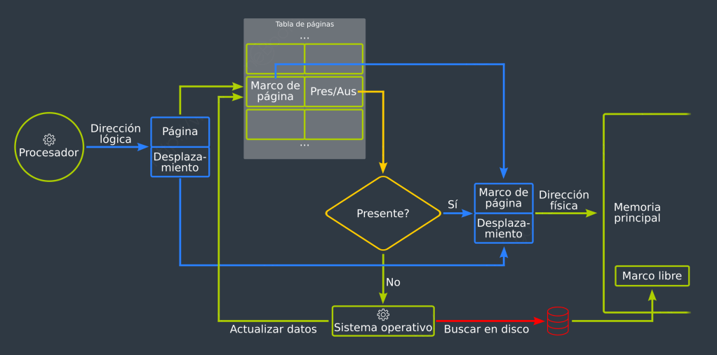 Se encarga de la asignación de memoria, donde el núcleo asigna un bloque para el uso de un proceso cuando se crea. Esto incluye la memoria para el código del programa, los datos y la pila. Cuando un proceso finaliza, el núcleo libera la memoria que había asignado. Para optimizar el uso de la memoria, el núcleo utiliza un sistema de paginación, dividiendo la memoria en páginas (generalmente de 4 KB) y moviendo páginas entre la memoria RAM y la unidad de almacenamiento (swap) según sea necesario. Esto permite que el sistema ejecute más procesos de los que la memoria física puede contener.
