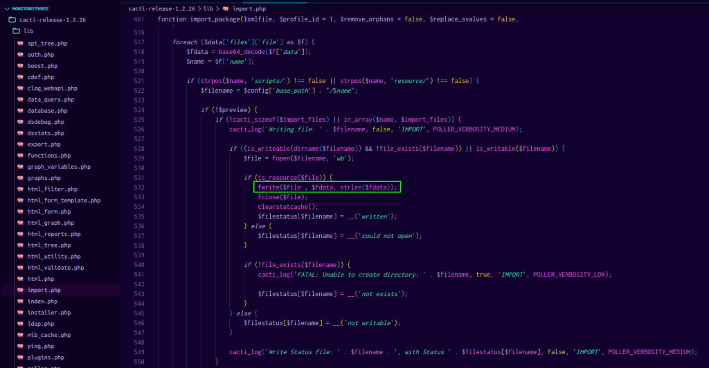 La función no filtra adecuadamente en el nombre y el contenido del archivo proporcionados en los datos XML y escribe dichos archivos en la ruta base de Cacti (o incluso fuera de ella, ya que las secuencias de recorrido de la ruta no se filtran). Esto se puede aprovechar para escribir o sobrescribir archivos arbitrarios en el servidor web, lo que provoca la ejecución de código PHP