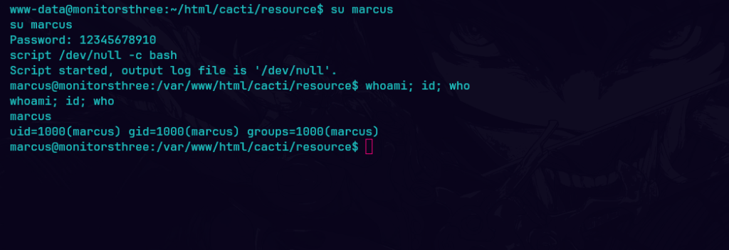Reutiliza las credenciales tanto el servicio cacti como en el servidor, asique me auténtico con el usuario marcus.