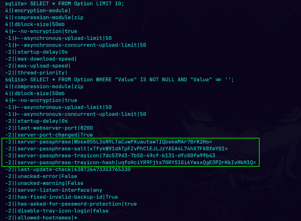 Sobre Duplicati-server.sqlite en la tabla option visualizo “passphrase”