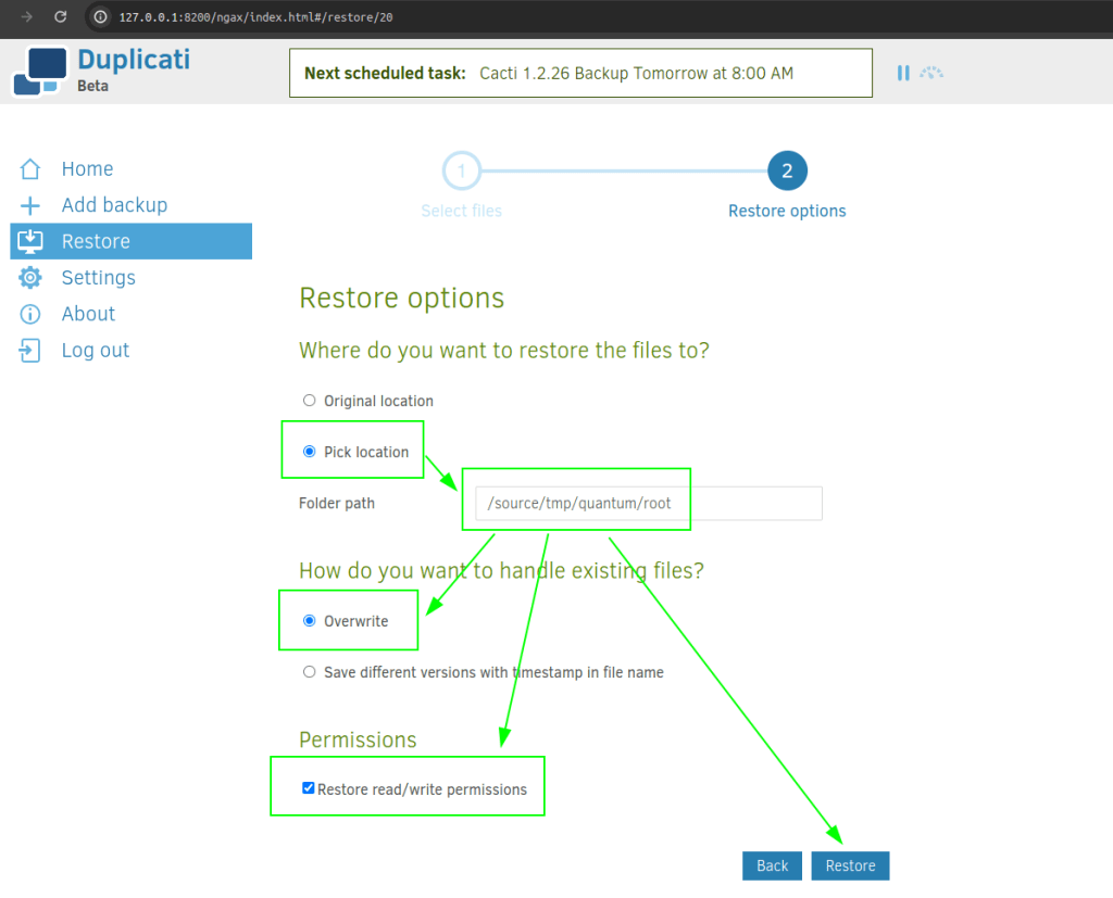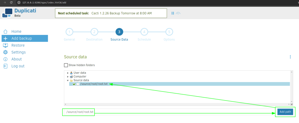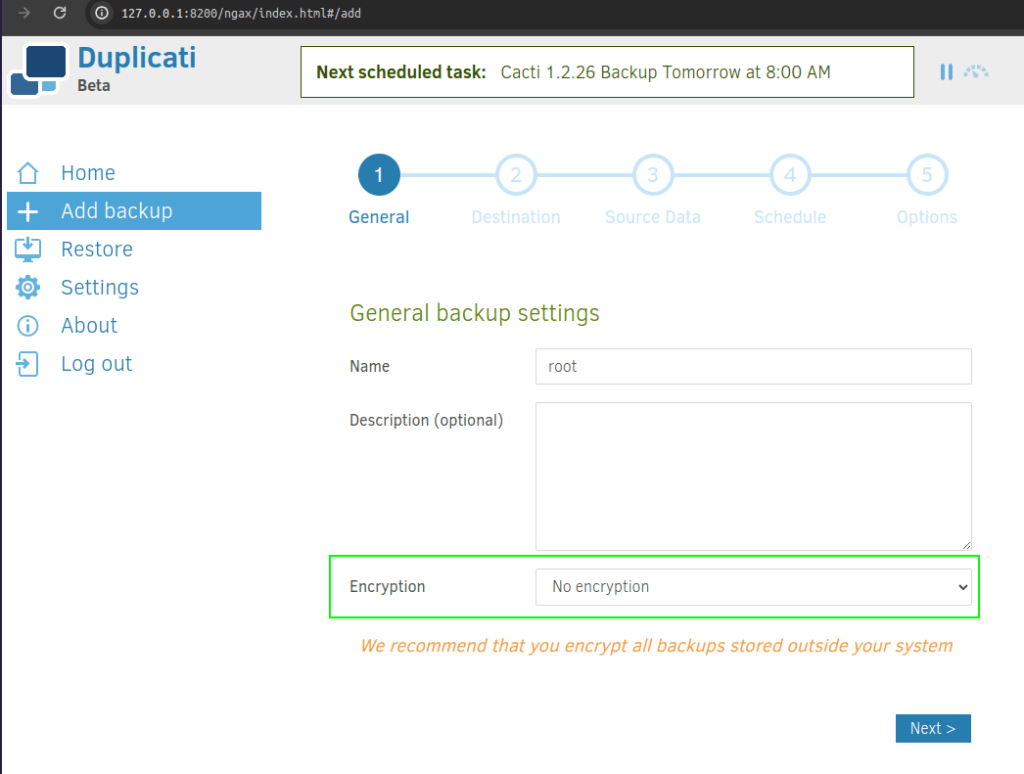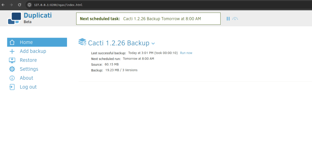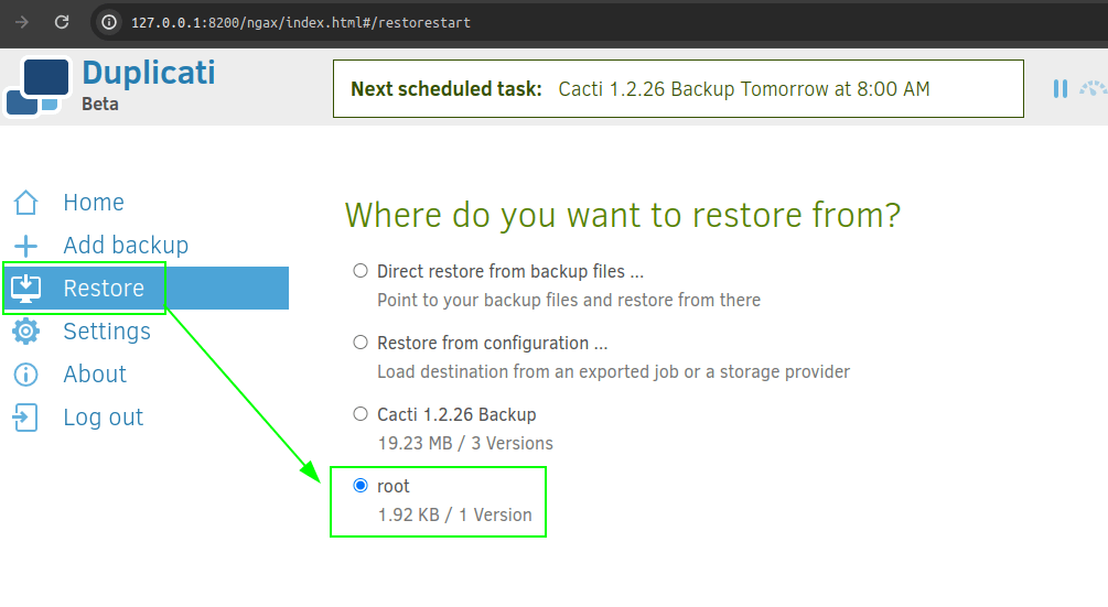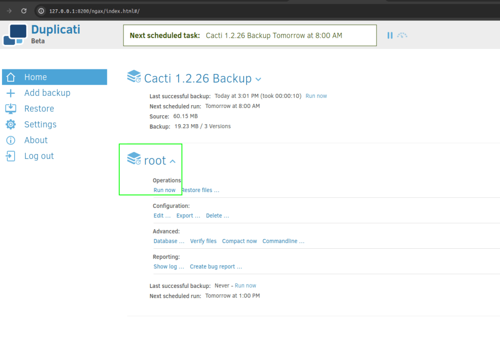 Accedo al panel de Duplicati, genera y almacena copias de seguridad y lo está corriendo root.