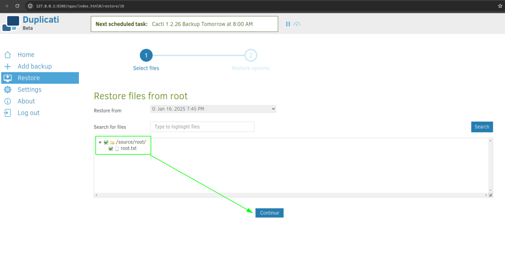 Selecciono la ruta a restaurar en donde se alojara la flag de root.