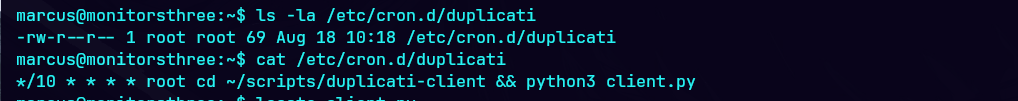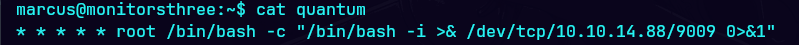 Genero todos los pasos anteriores, pero esta vez en /home/marcus/ genero una revshell que se ejecute en cron con privilegios de root, creo la copia de seguridad, lo restauro y configuro que apunte a cron.