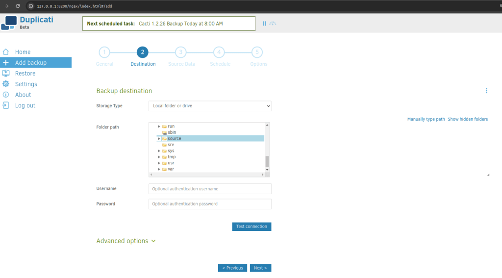 Indico el tipo de almacenamiento local folder or drive y utilizo el directorio fuente /source/.