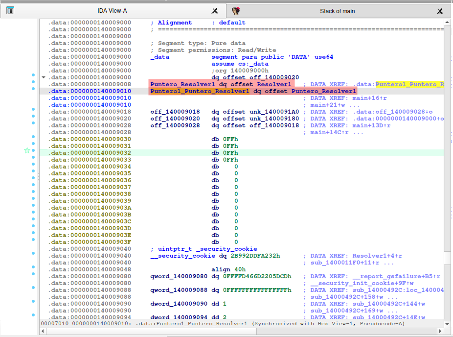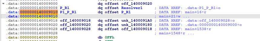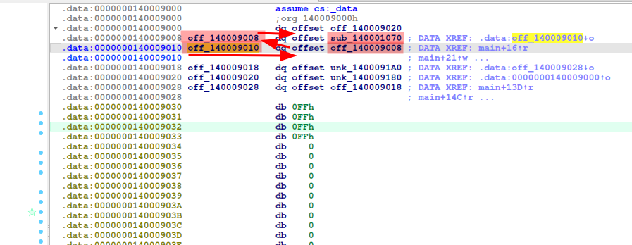 El puntero 0ff_140009010 sigue a la variable (puntero) 0ff_140009008, finalizando a la dirección (función) sub_140001070.