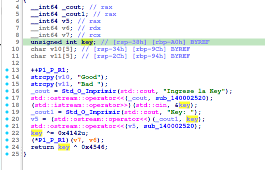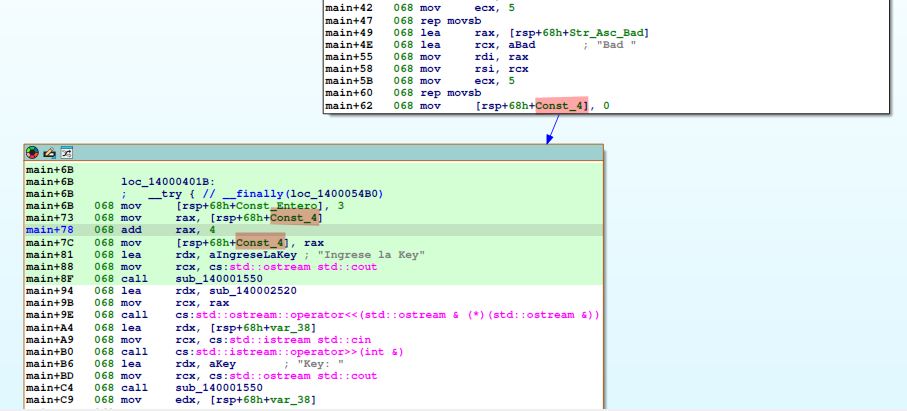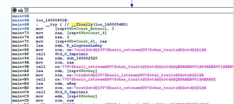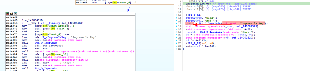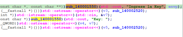 “cout” imprime “Ingrese la Key”, por medio de la función sub_140001550.