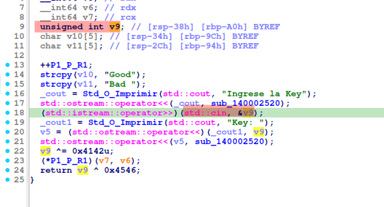 “v9” Está determinado como un entero, y se le va a signar un valor por medio de std::cin, &v9, puedo verificar que se le asignara la “Key:“, asique modifico v9 por “key“