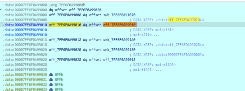 off_140009010 apunta a off_140009008 Y este finalmente lleva a la función sub_140001070.
