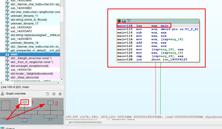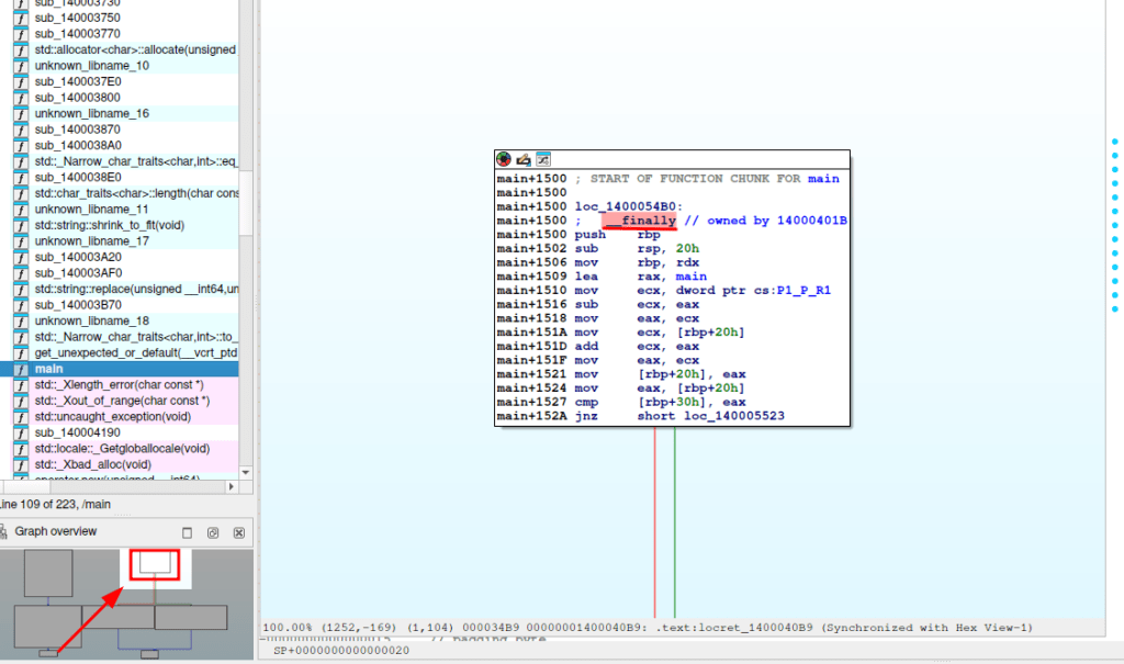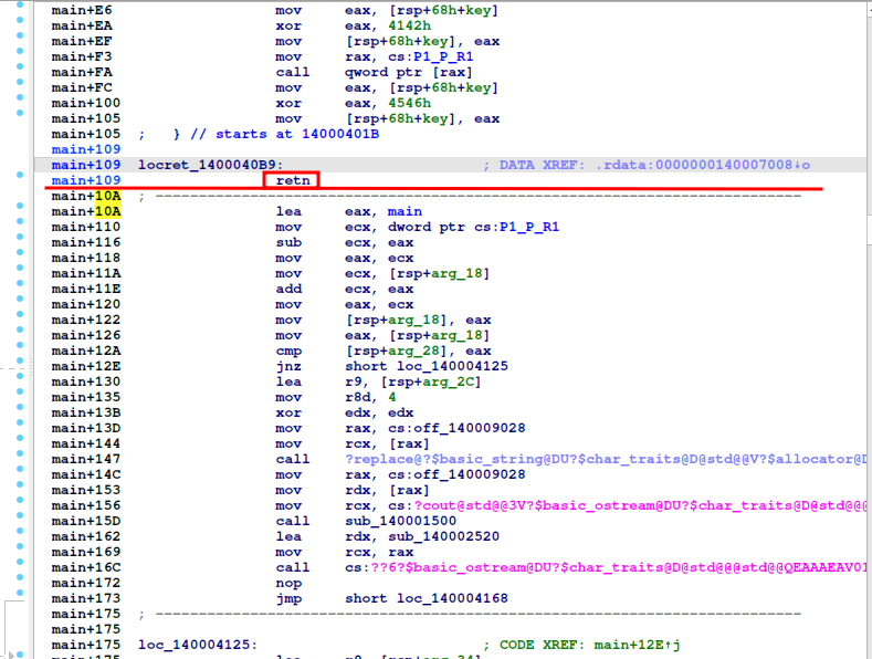 La instrucción retn en main+109 marca el fin lógico del programa. El código posterior main+10A es inalcanzable debido al crash previo, asique lo marco como indefinido ya que no se va a ejecutar.