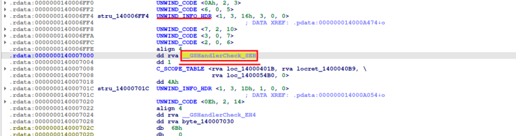 UNWIND_INFO tiene el Handler general, que maneja las funciones.