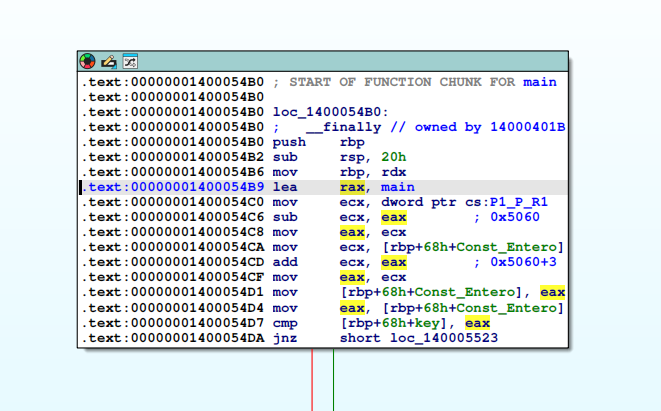 Termina redirigiendo al __finally, sigo el flujo levanta el main (rax, main), sigue con el contenido de P1_P_R1 que crasheaba, pero levanta un dword, luego resta ese dword con el dword final de main.