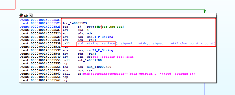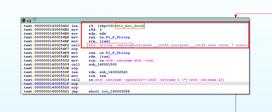 Entonces std::string::replace obtiene el contenido en [rax] de P1_P_String y le reemplaza la parte ascii, comienza los argumentos por edz y termina en r8d, va a hacer un replace sobre los 4 caracteres para meter el Good dentro de “GOOD Boy”.